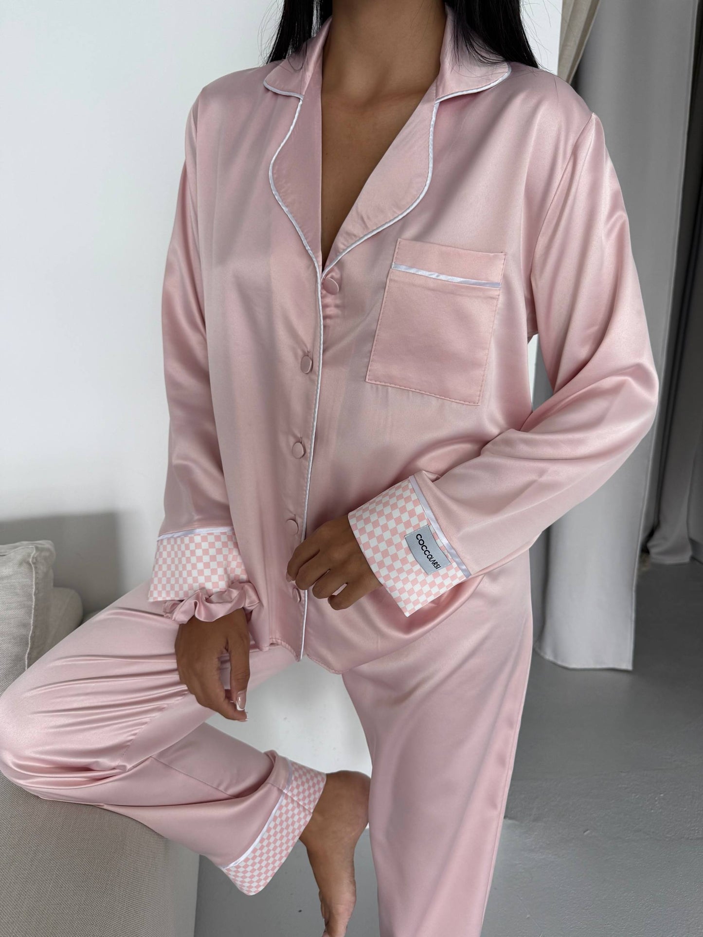Made from silky satin with delicate white piping and subtle checkered cuff details, it combines elegance with comfort. Perfect for relaxing at home, bridal sleepwear, or as a thoughtful gift. 🌙💗