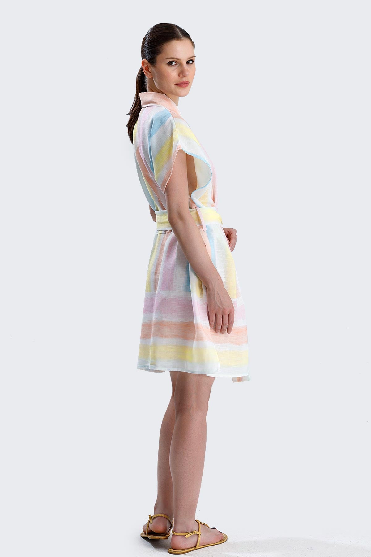 Crafted from lightweight linen-blend fabric with soft pastel stripes, this dress captures the essence of laid-back summer sophistication β perfect for seaside strolls, brunch dates, or lounging at home.