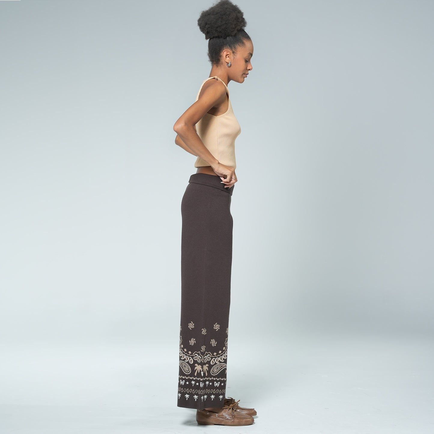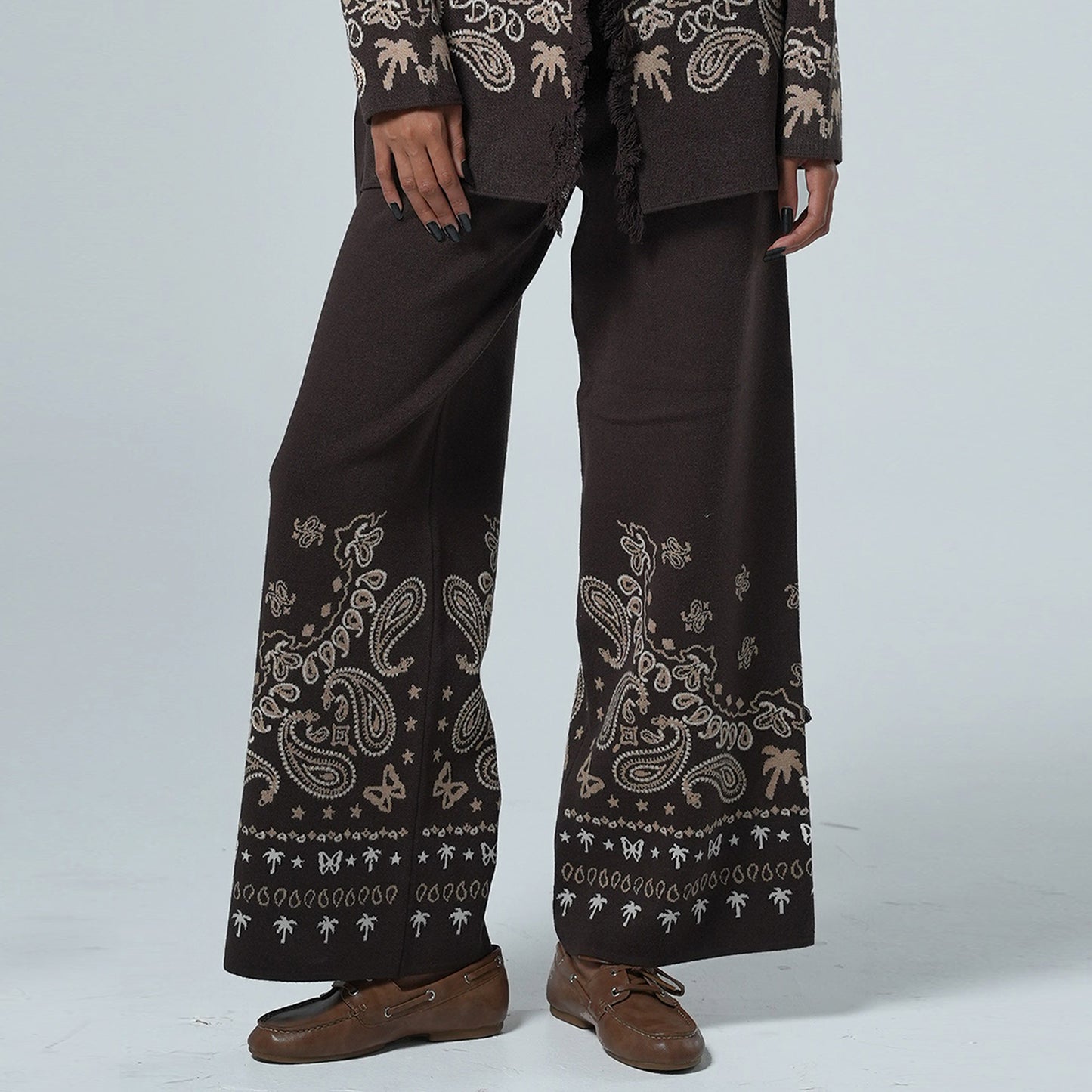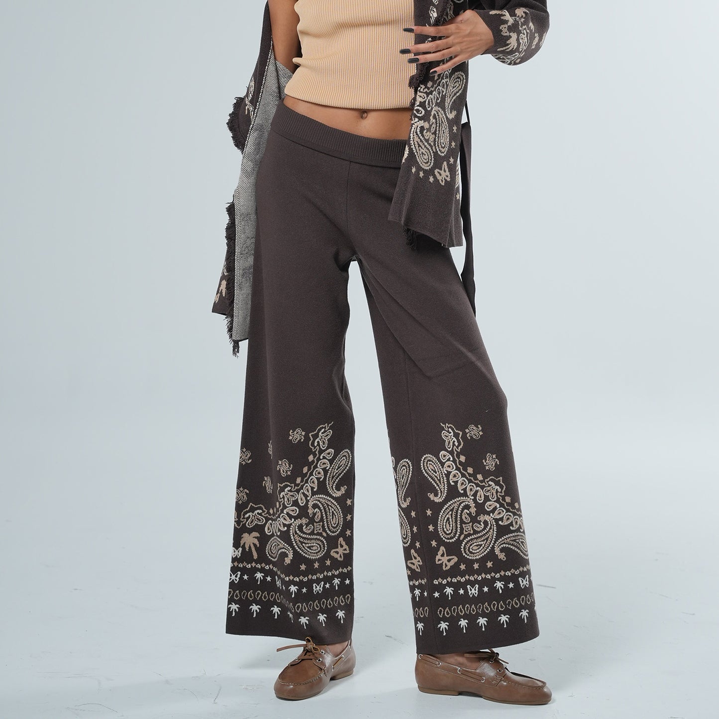 Crafted in a soft brown and beige jacquard knit, they feature an elegant paisley-inspired border and a relaxed, fluid silhouette that moves beautifully with every step.