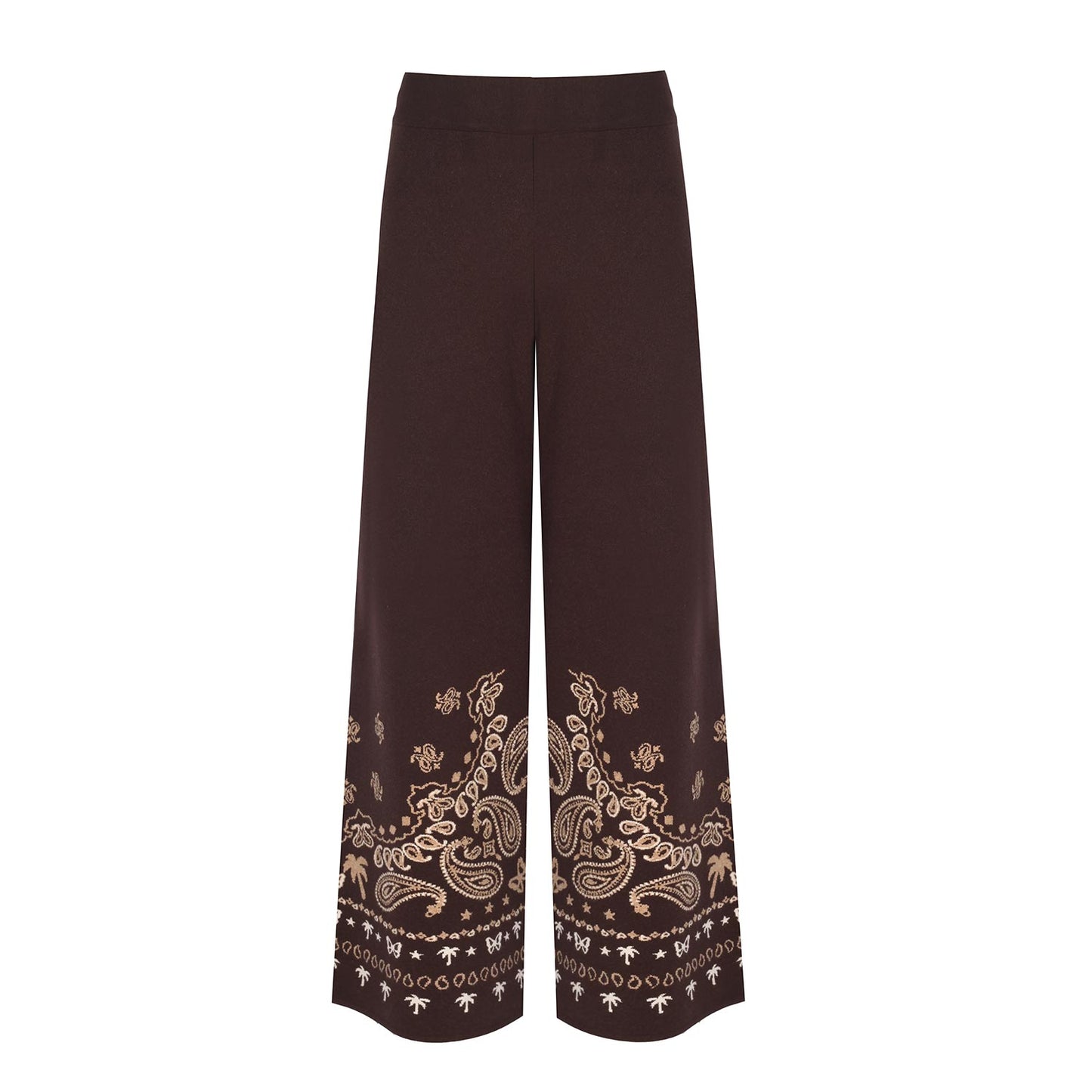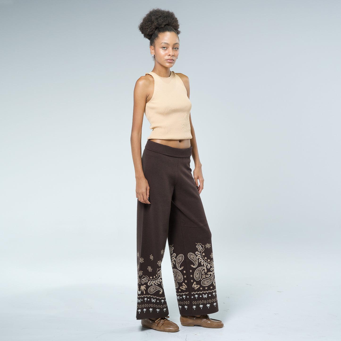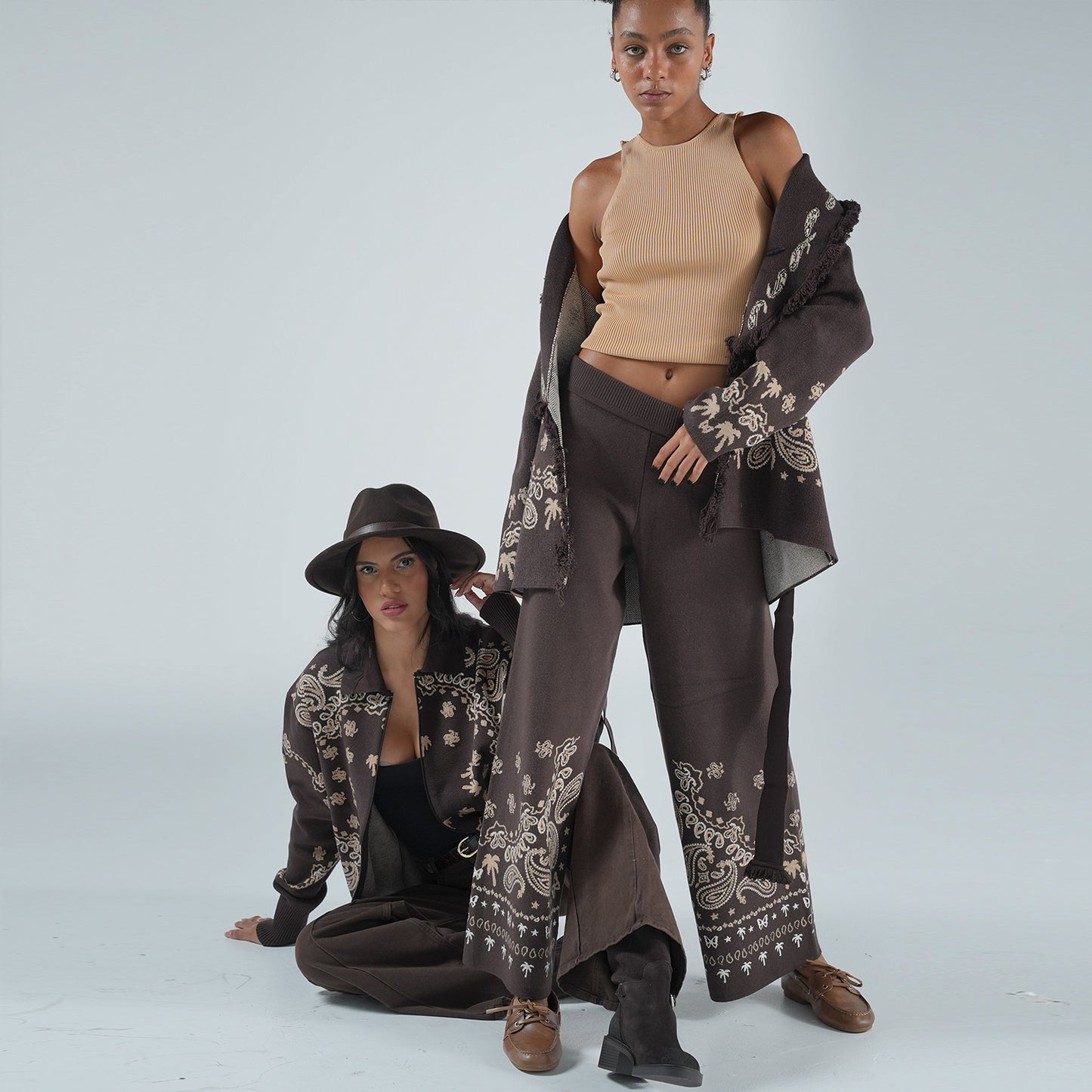 Crafted in a soft brown and beige jacquard knit, they feature an elegant paisley-inspired border and a relaxed, fluid silhouette that moves beautifully with every step.