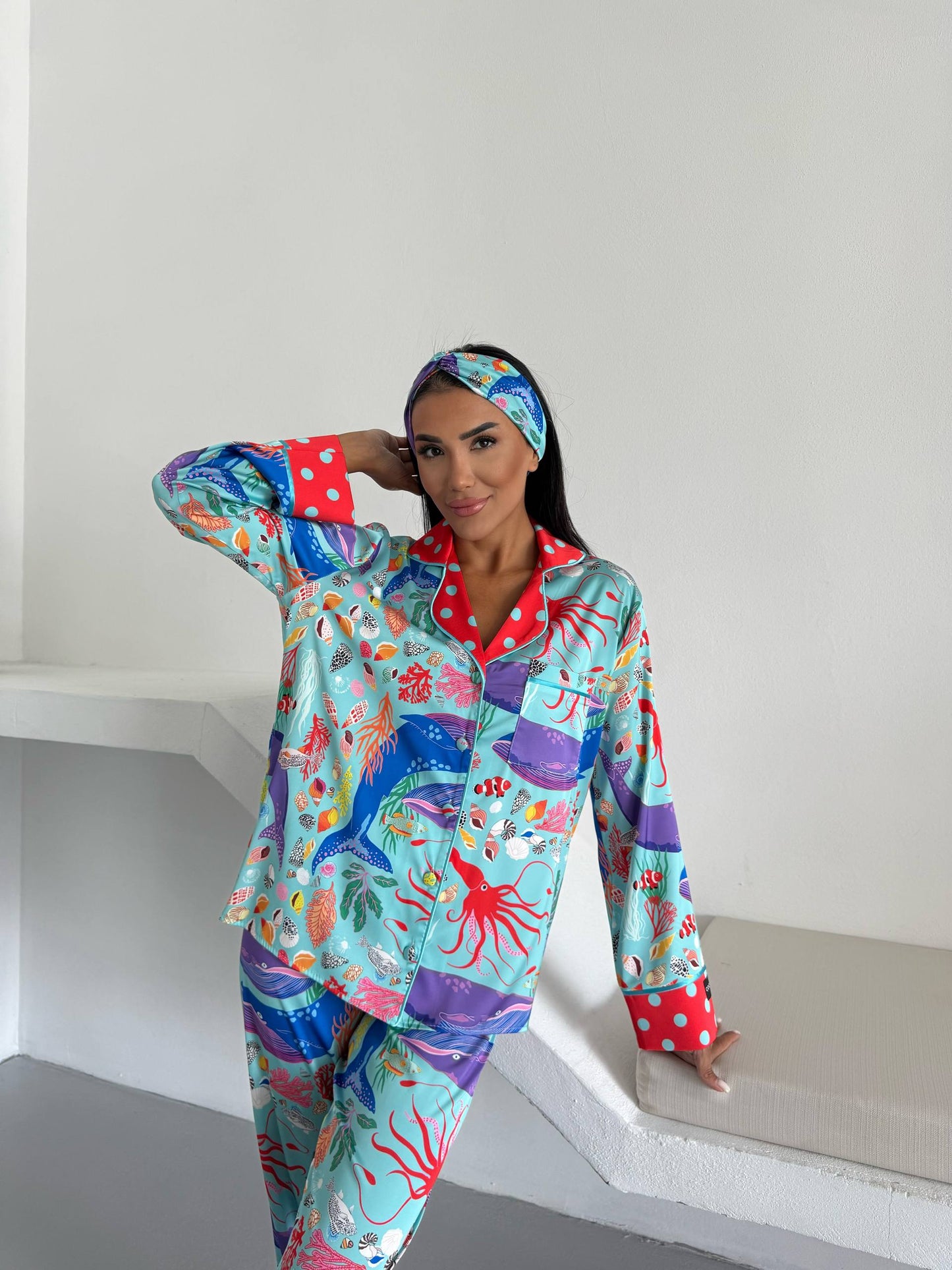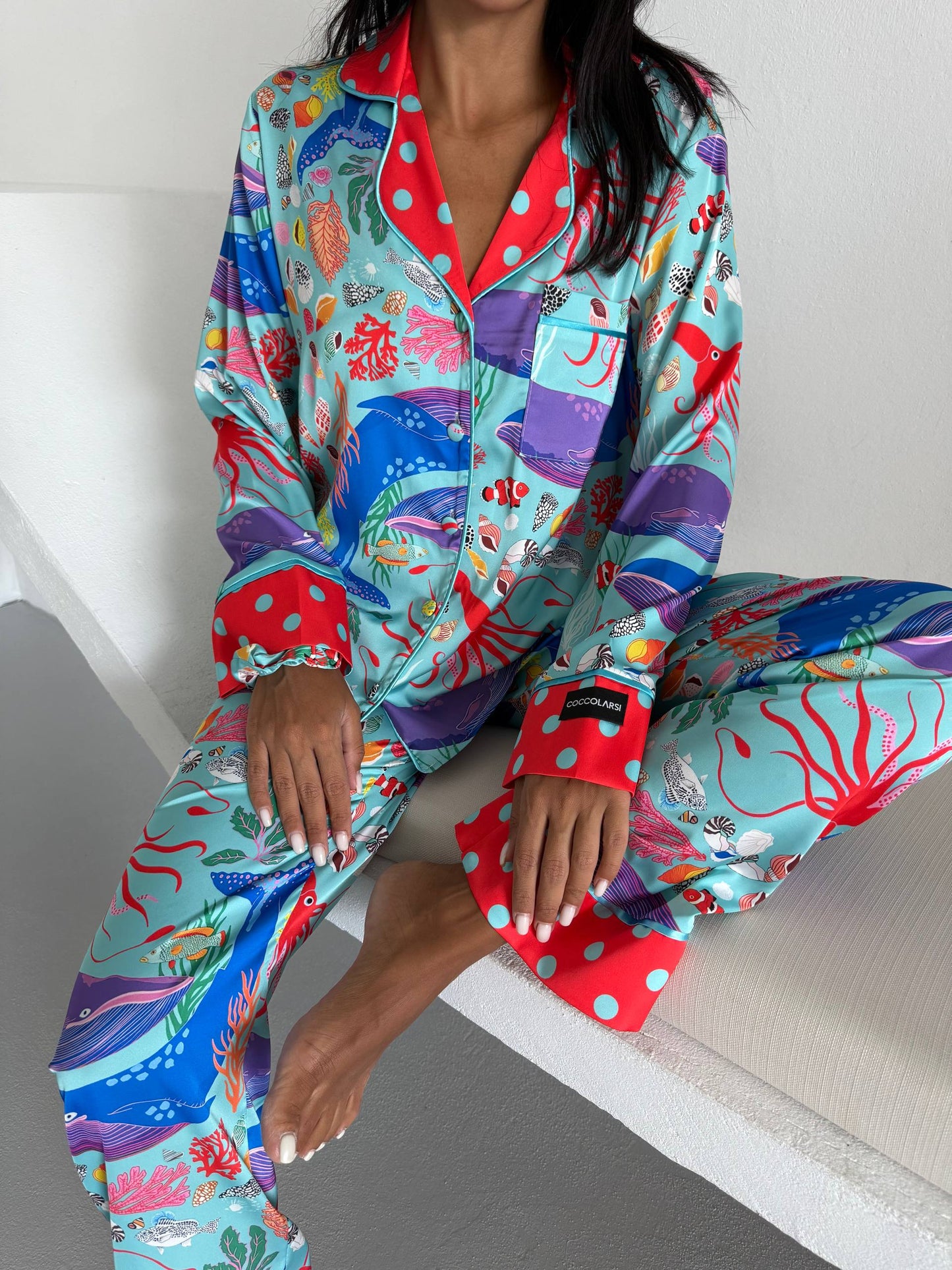 Dive into comfort with this ocean-inspired satin pajama set. 🐠✨