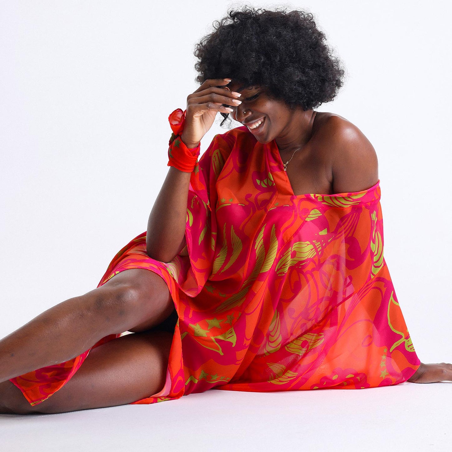 Turn heads with the bold elegance of the Orneta Kaftan — a radiant fusion of hot pink and citrus orange that captures the rhythm of tropical sunsets.