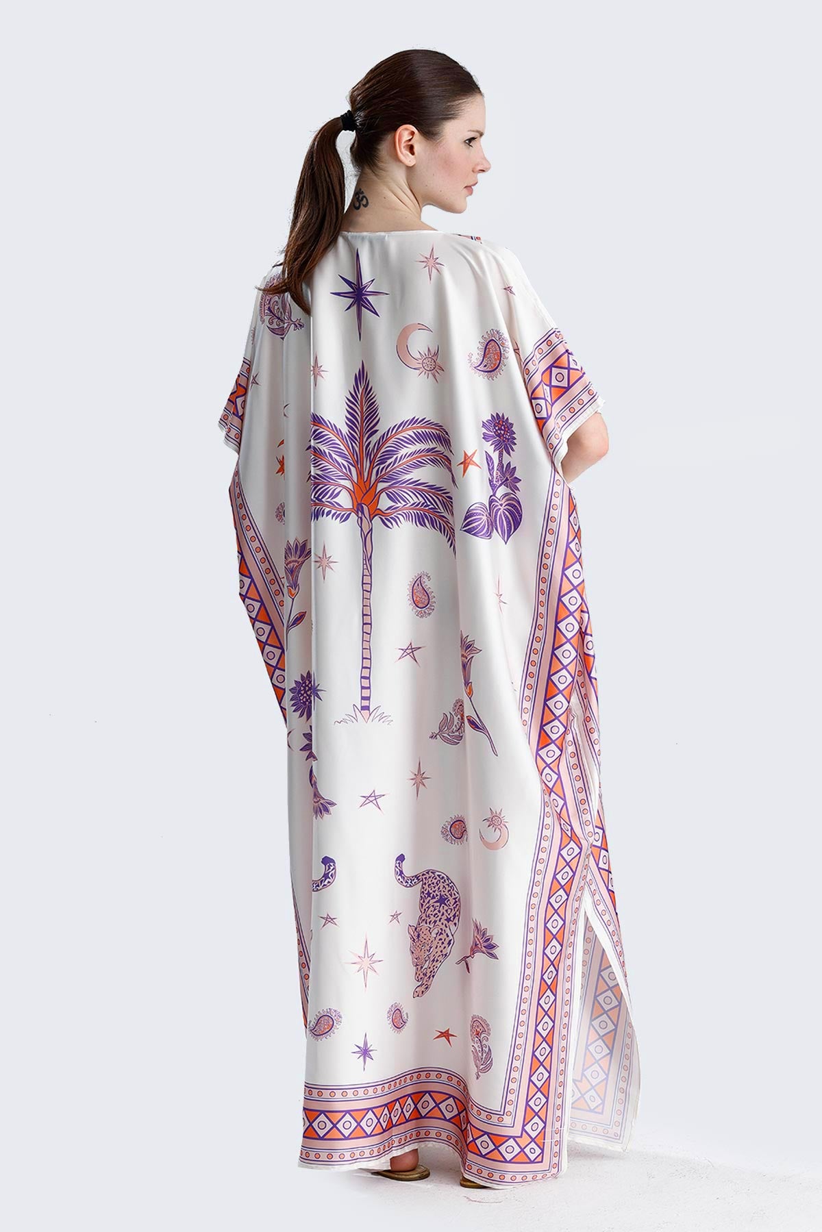 The Morocco Kaftan blends exotic patterns, cosmic motifs, and effortless elegance — a statement piece for your resort wardrobe.