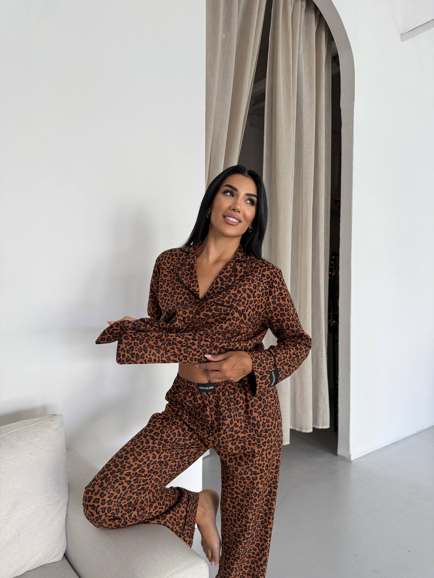 Bring a touch of wild elegance to your nights with this brown leopard satin pajama set. ✨