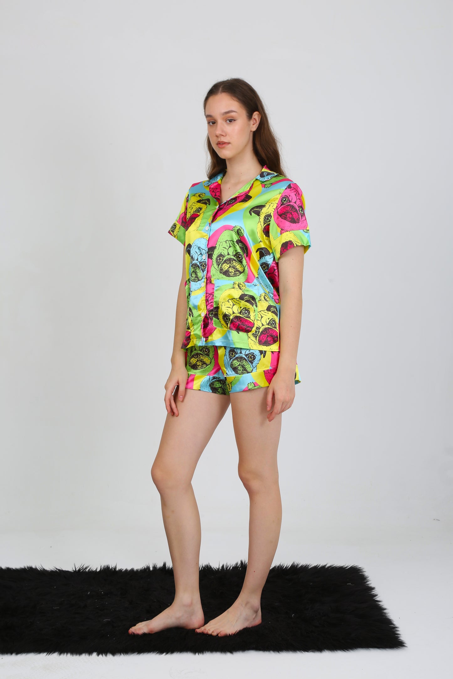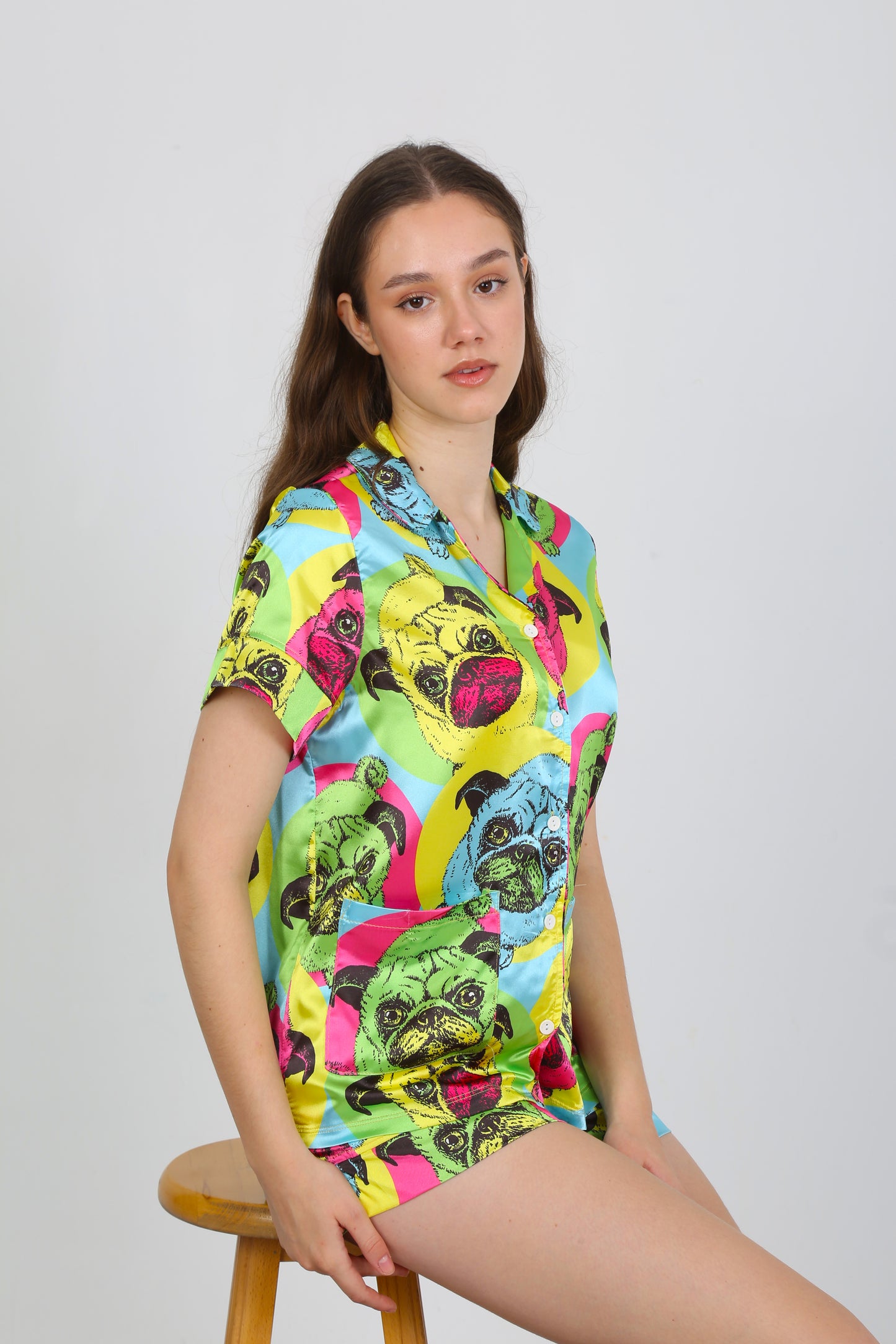 The Pop Art Pug Pajama Set blends comfort with creativity, featuring a glossy satin fabric covered in a bold multicolor pug print inspired by pop art. Designed for women who love fun, confidence, and comfort in equal measure.