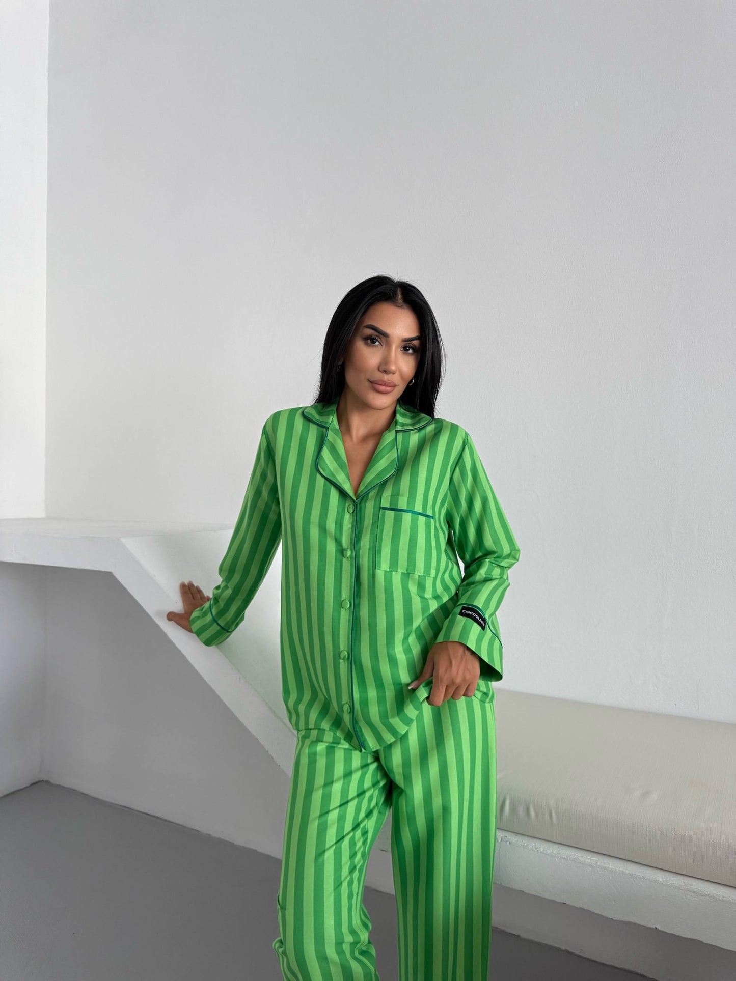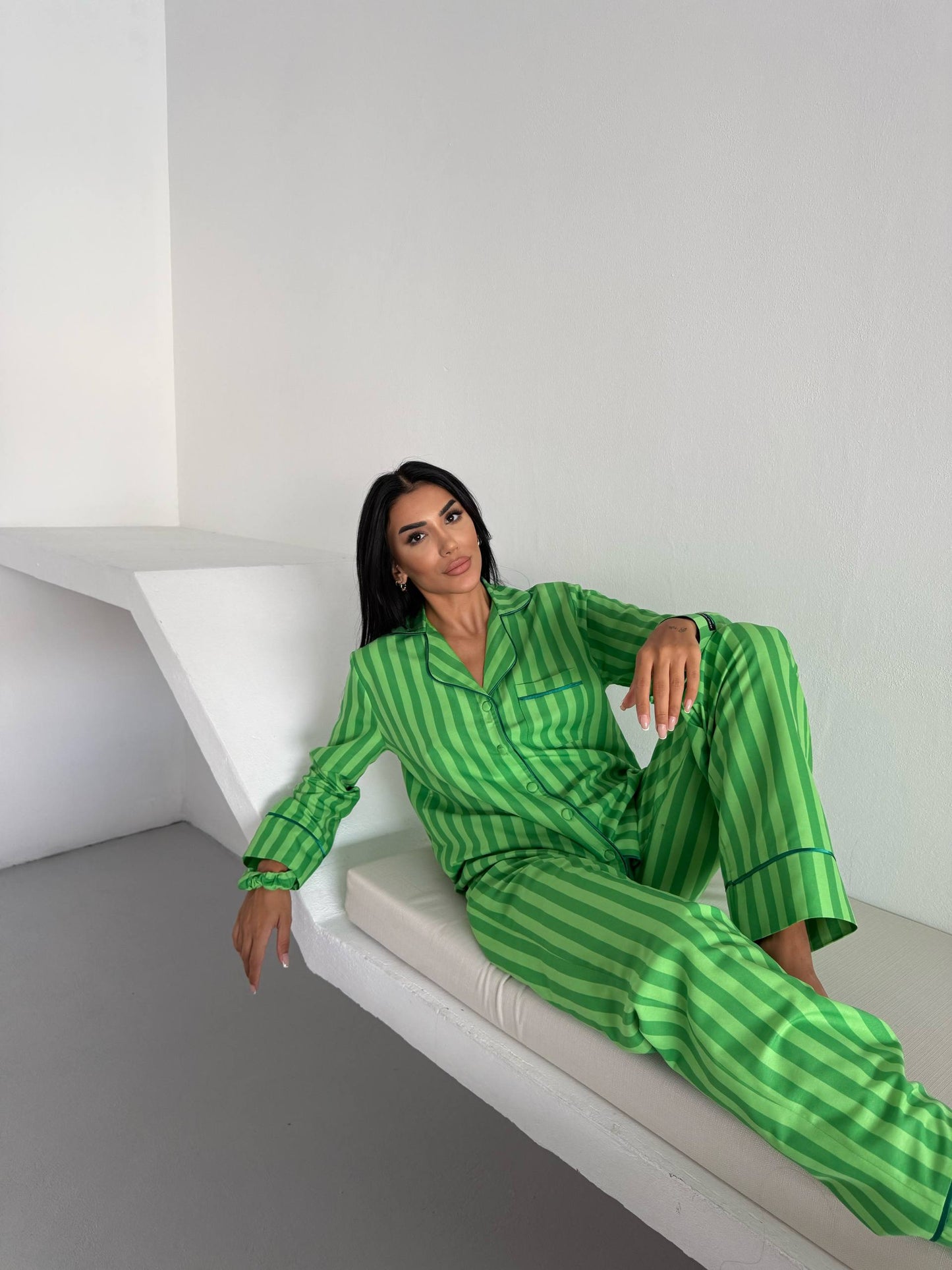 Bring fresh energy to your nights with this green striped satin pajama set. ✨