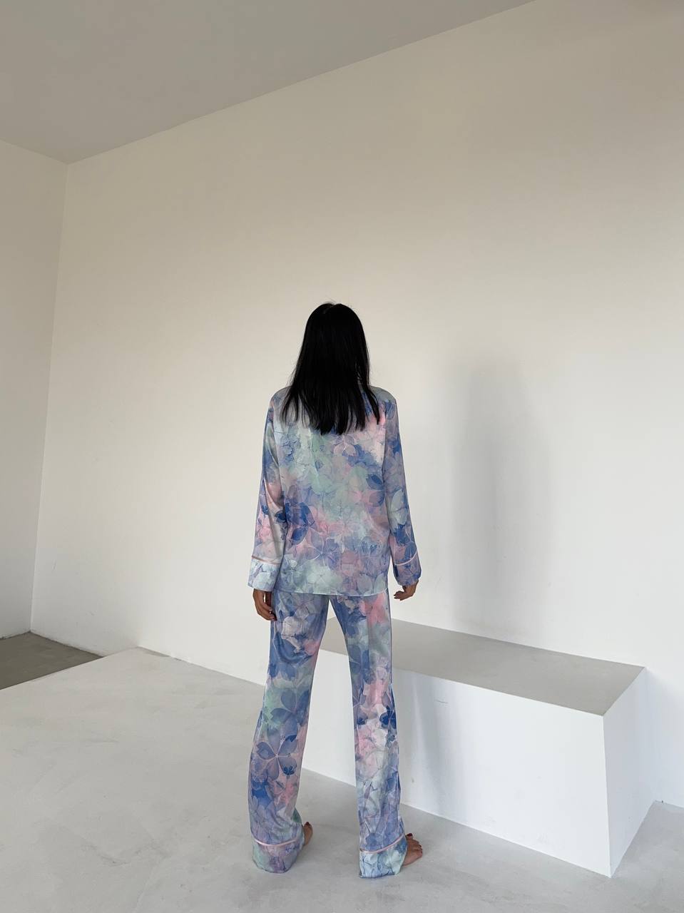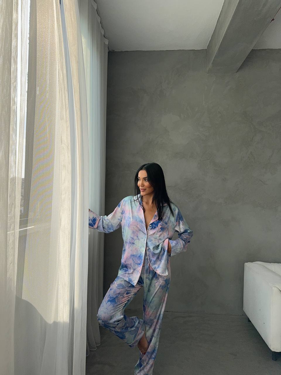 Bring effortless elegance to your nights and slow mornings. This printed satin pajama set includes a classic collared, button-front shirt with a chest pocket detail and matching relaxed pants with an elastic waistband. The satin fabric feels soft and silky against the skin and drapes beautifully for a refined, comfortable fit—perfect for sleepwear, loungewear, travel, and gifting